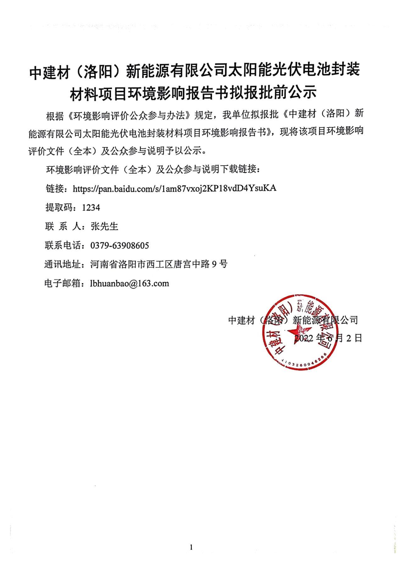 中建材(洛陽(yáng))新能源有限公司太陽(yáng)能光伏電池封裝材料項(xiàng)目環(huán)境影響報(bào)告書(shū)擬報(bào)批前公示