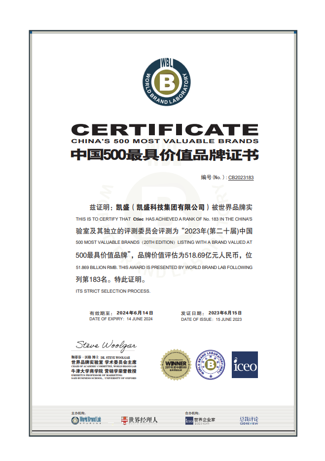 6月15日,由世界品牌實(shí)驗(yàn)室(World Brand Lab)主辦的2023年“中國(guó)500最具價(jià)值品牌”發(fā)布會(huì)在北京舉行,“凱盛”品牌首次參評(píng),即以518.69億元人民幣的品牌價(jià)值,位列榜單183位。